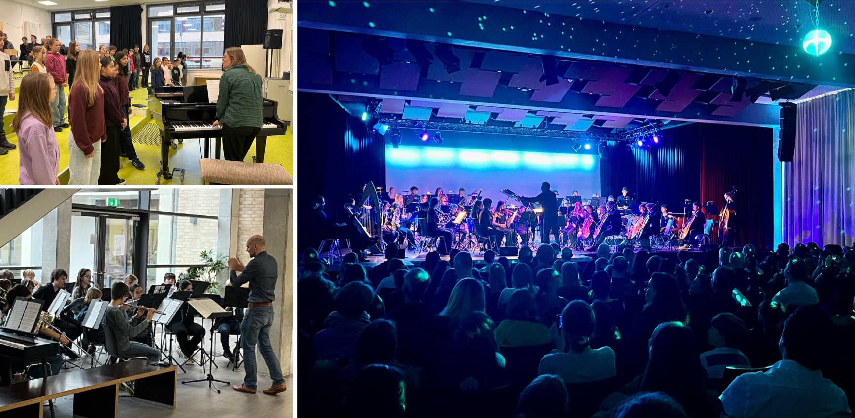 Die Proben sind nun beendet, die jungen Musikerinnen und Musiker bekommen ihren wohlverdienten Applaus – jetzt noch schnell eine Waffel gegessen und dann aber nichts wie hoch in die Aula zum großen Kinderkonzert. Hier ist bereits alles vorbereitet. Und da kommen auch schon die Musikerinnen und Musiker des Schulorchesters. Ein kurzes Stimmen der Instrumente, eine Ansprache des stellvertretenden Schulleiters Herrn Paesler und dann spielen sie mit vollem Einsatz, Leidenschaft und beachtenswerter Ausdrucksstärke die Musik aus „Peer Gynt“ von Edward Grieg. Doch die heimlichen Stars dieser Veranstaltung sind die beiden Moderatoren Raphael Legrand und Daniel Imhof. Sie begeistern die Kinder (und auch deren Eltern!) mit einer Mischung aus fesselndem Märchenerzähler und witzigem Entertainer mit schauspielerischem Esprit.