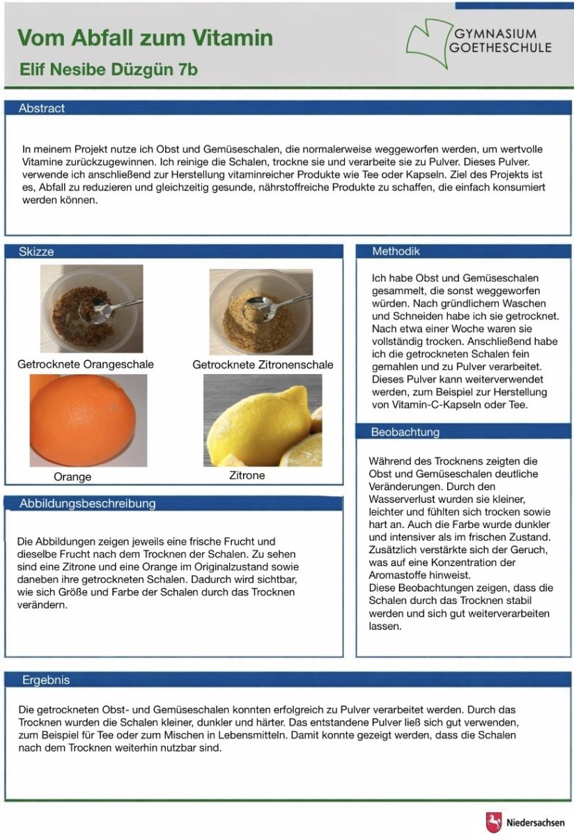 Elif Nesibe Düzgün gewinnt mit ihrem Projekt Vom Abfall zum Vitamin einen Förderpreis des Freimaurerischen Kultur- und Sozialwerks Friedrich zum weißen Pferd gGmbH, da ihr Projekt mit Weitsicht im Hinblick auf Ressourcensparen erarbeitet wurde.
