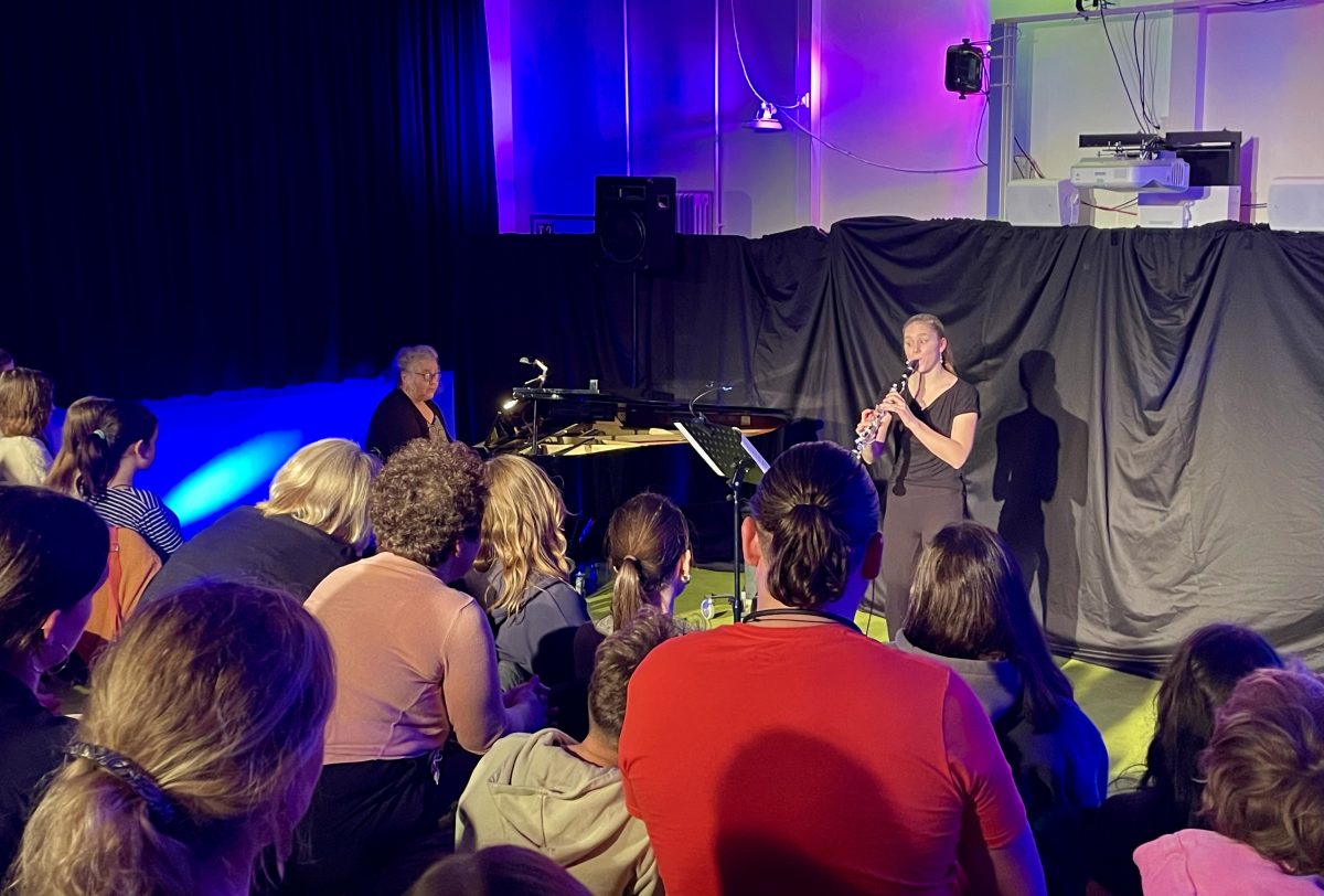 Das gesamte Konzept des Abends wurde von den Schülerinnen und Schülern entwickelt, organisiert und mit großer Professionalität umgesetzt. Larissa führte elegant und gewitzt durch den Abend. Mal solistisch, mal mit Begleitung und mal in kleiner Formation: Im Rahmen des Konzerts präsentierten die angehenden Abiturientinnen und Abiturienten ausgewählte Stücke aus ihrem Programm für die fachpraktischen Prüfungen.