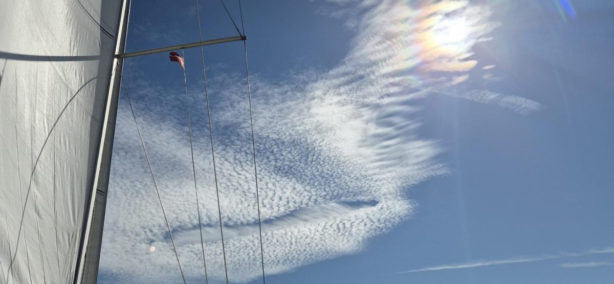 Nach dem ersten Bericht war der heutige Tag dann noch sehr ereignisreich. Die Flaute wurde zum Beispiel dazu genutzt, Manöver-Übungen zu fahren – zunächst mit Fendern, die über Bord gingen, dann mit dem Skipper, der über Bord gesprungen ist. Dieser ist erfolgreich wieder eingesammelt worden. Allerdings wurde ein Teil der Rest der Crew hiervon inspiriert, ebenfalls ins Wasser zu springen, womit erstmal ein bisschen gebadet wurde.