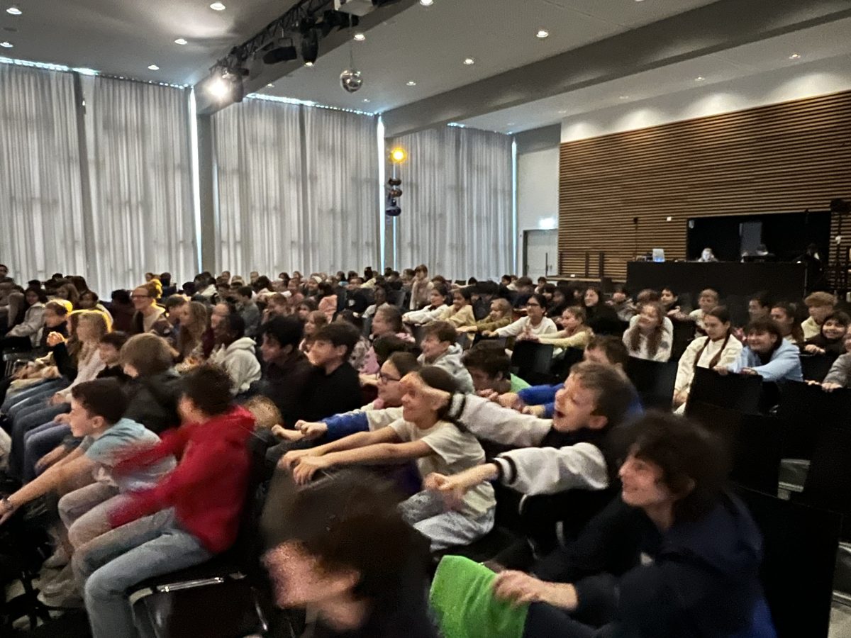 Gespannt und konzentriert lauschte das junge Publikum der Orchestermusik sowie den beiden launigen Moderatoren Raphael Legrand und Daniel Imhof, welche die Geschichte erzählten und feinfühlig auf die Merkmale und den Charakter der einzelnen Stücke aufmerksam machten. Zu ihrer großen Freude wurden die Schülerinnen und Schüler immer wieder auch aktiv in das Geschehen eingebunden … unter anderem mit dem Singen der oben angedeuteten Melodie („bopp“).